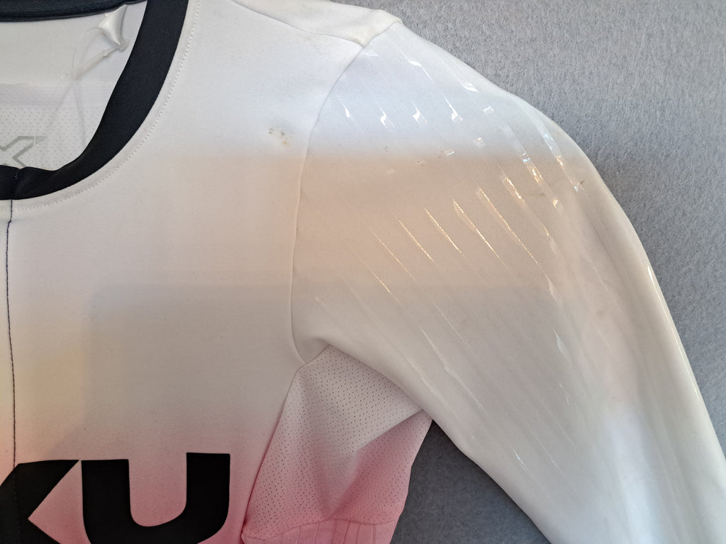Als B-Ware weist der Trisuit leichte Verschmutzungen auf (siehe 6./7./8. Bild), die die Funktionalität jedoch nicht beeinträchtigen. Er wurde sorgfältig geprüft und ist voll funktionsfähig. Bitte beachten Sie, dass kein Umtausch möglich ist.
