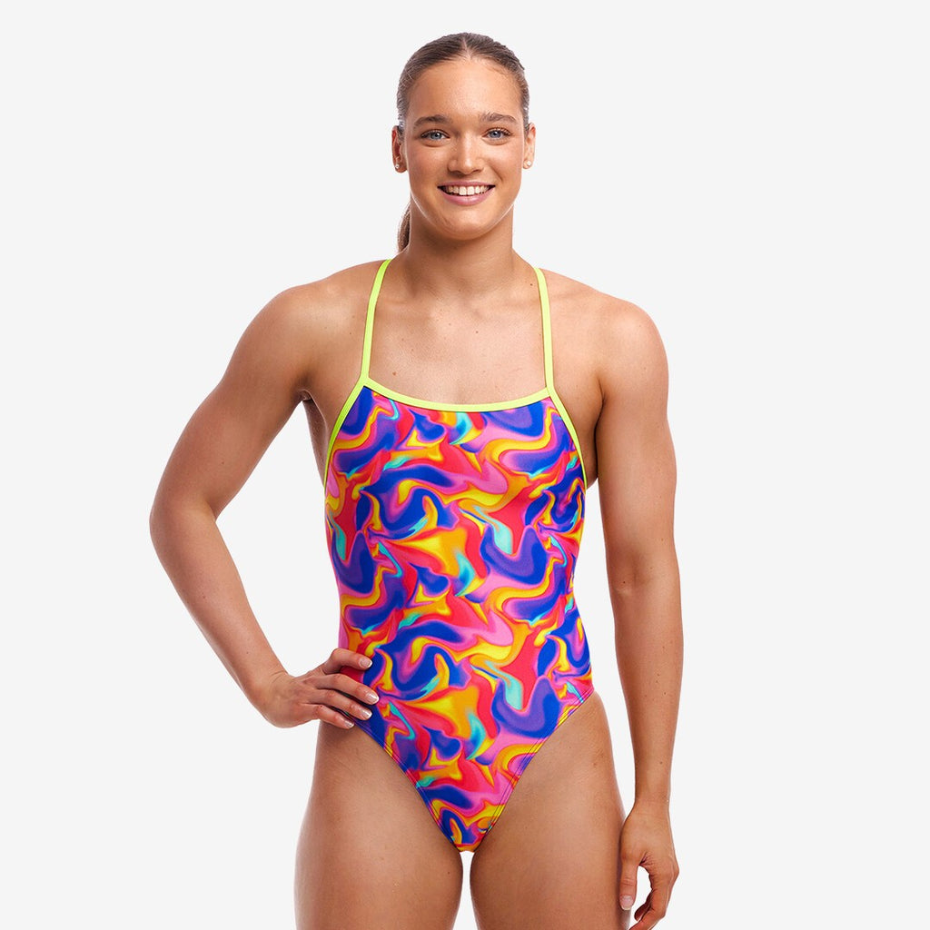 Mit dem Funkita Damen Trainingsbadeanzug Strapped In kannst du deinen Rücken gekonnt in Scene setzten. Die schmalen Träger laufen im Zick Zack über deinen Rücken und der Beinausschnitt ist extra hoch, damit du die größtmögliche Bewegungsfreiheit hast. Damit vorne nicht rausblitzen kann hat der Badeanzug ein Innenfutter im Frontbereich.