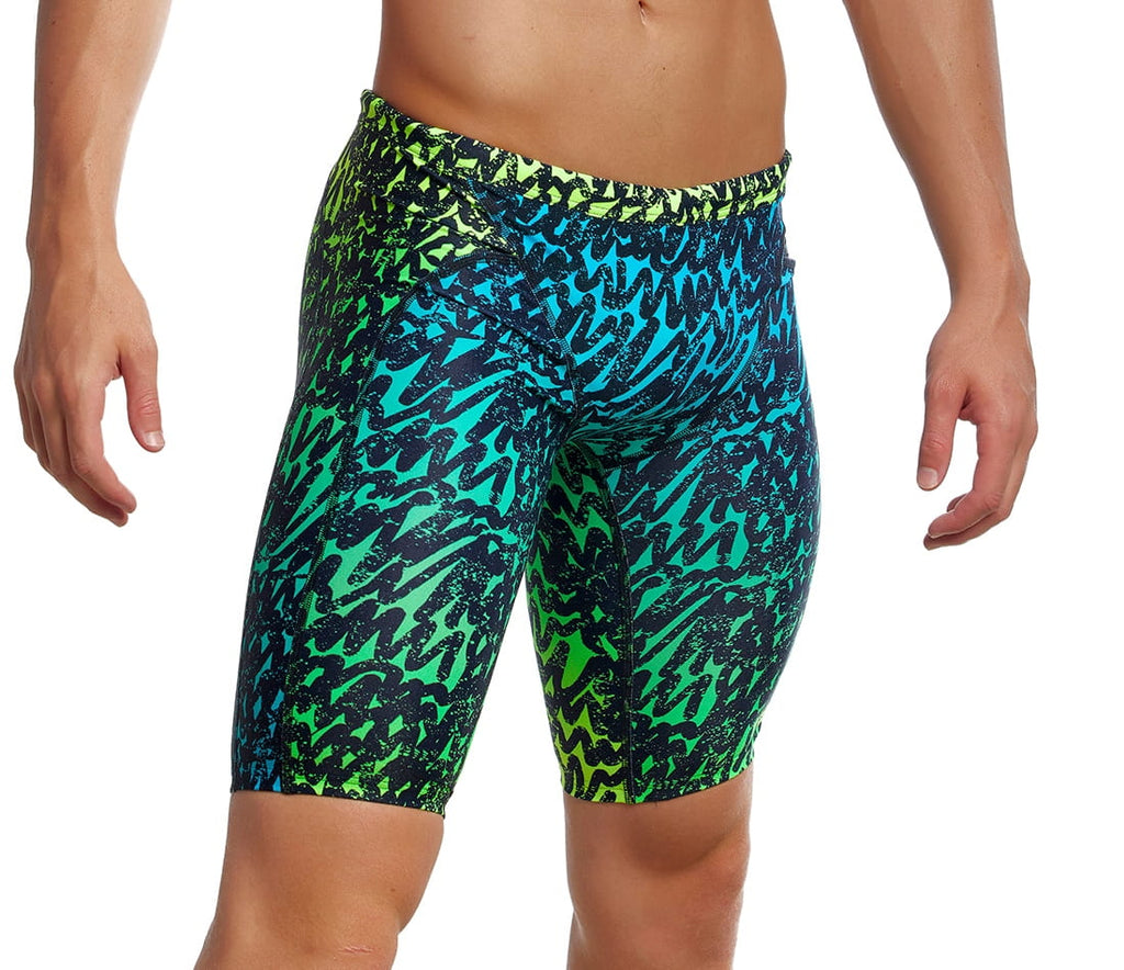 Der Trainingsjammer von Funky Trunks ist eine beliebtes Modell für Schwimmer und Triathleten. Die Nähte sind extra flach, die Beinöffnung ist bequem geschnitten und für besseren Halt gibt es im Bund einen Kordelzug. Durch das verwendete, chlorbeständige C-Infinity-Gewebe, bleibt der Jammer so strahlend wie am ersten Tag.