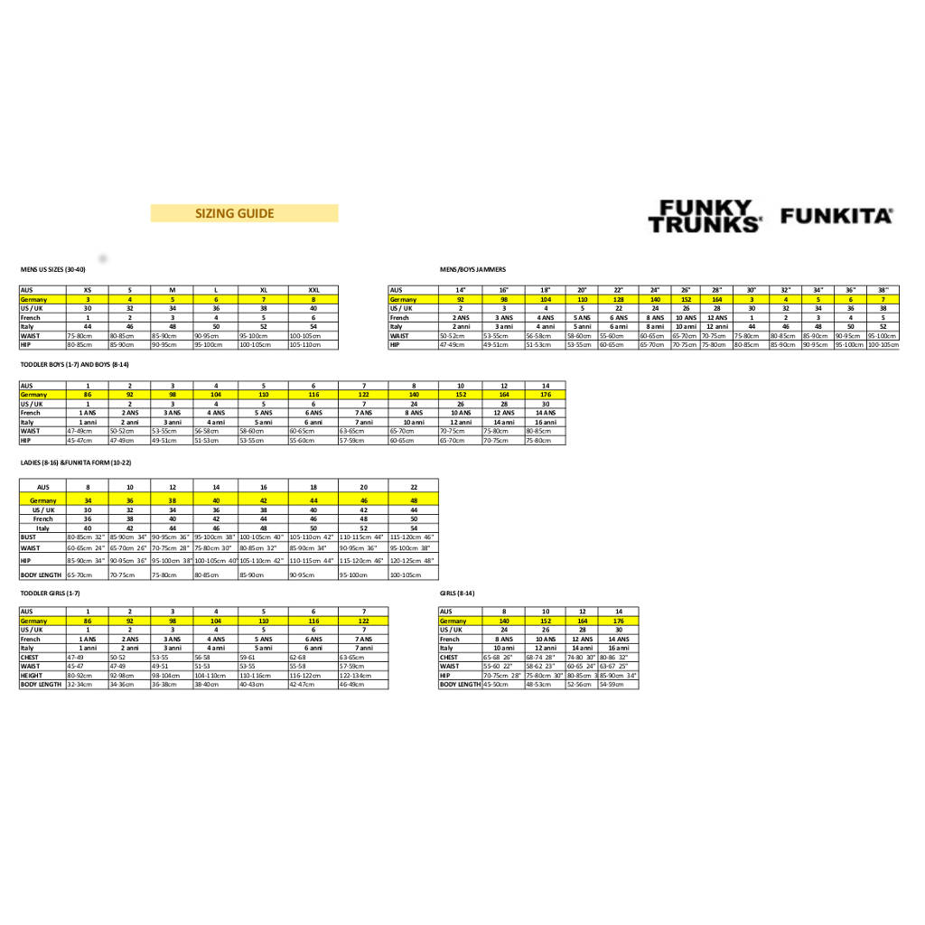 Durch das verwendete, chlorbeständige C-Infinity-Gewebe bleibt das Muster so farbecht und strahlend wie am ersten Tag. Das italienische Material wird exklusiv für Funkita und Funky Trunks verwendet, es ist besonders strapazierfähig, schnelltrocknend, elastisch, atmungsaktiv und bietet dabei eine feste Kompression. Zudem kommt noch 50+ UV Schutz dazu.
